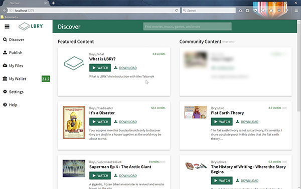- 0:05 – Discover: LBRY's home content discovery screen. Content on the left is featured and updated by LBRY. Content on the right comes directly from community bids.